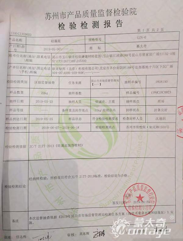 2019年5月,昆山市市場(chǎng)監(jiān)督管理局對(duì)蒙太奇硅藻泥產(chǎn)品進(jìn)行監(jiān)督抽查。檢驗(yàn)檢測(cè)結(jié)果顯示,蒙太奇硅藻泥產(chǎn)品未檢測(cè)出游離甲醛含量、可溶性重金屬以及苯、甲苯、乙苯、二甲苯有害物質(zhì)。