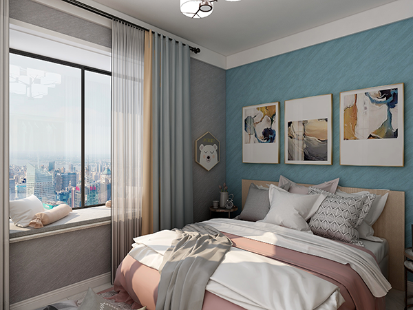 臥室的整體色系采用馬卡龍色,給人柔和的視覺(jué)效果。窗戶的設(shè)計(jì),使人每天早上起來(lái),都想說(shuō)一聲:你好,陽(yáng)光!松軟的大床使人更能放松,柔和的顏色,減少了精神的緊張,保障了戶主睡眠的質(zhì)量。