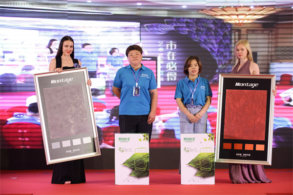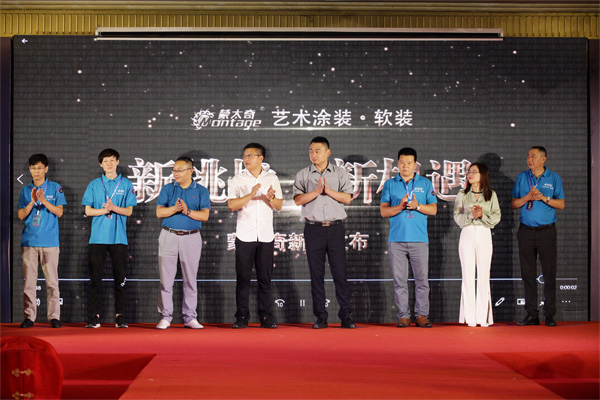 此次活動很大亮點當數(shù)新品發(fā)布?,F(xiàn)場,中國建筑裝飾裝修材料協(xié)會硅藻泥分會朱秘書長、蒙太奇董事長趙廣全攜公司高層領(lǐng)導、優(yōu)秀經(jīng)銷商代表依次登臺,伴隨音樂,共同按下啟動按鈕。當主屏幕蒙太奇新品發(fā)布會主形象呈現(xiàn)時,預示著蒙太奇新品將正式與大家見面。